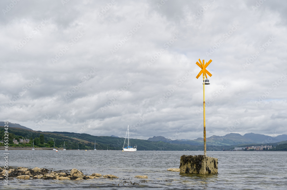 Yellow cross sign on coats to warn ships and boats if shallow water