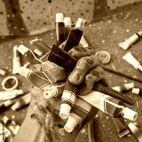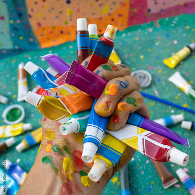 Handful of bright multi colored paint tubes