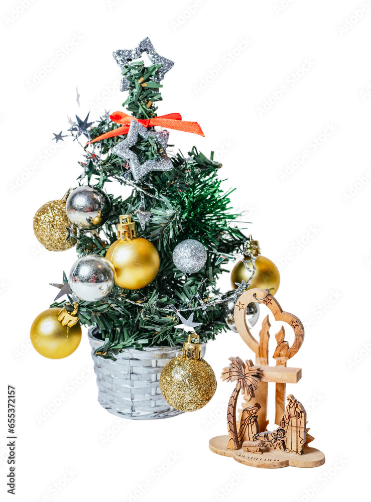 Wooden nativity scene and Christmas tree isolated on white or transparent background.