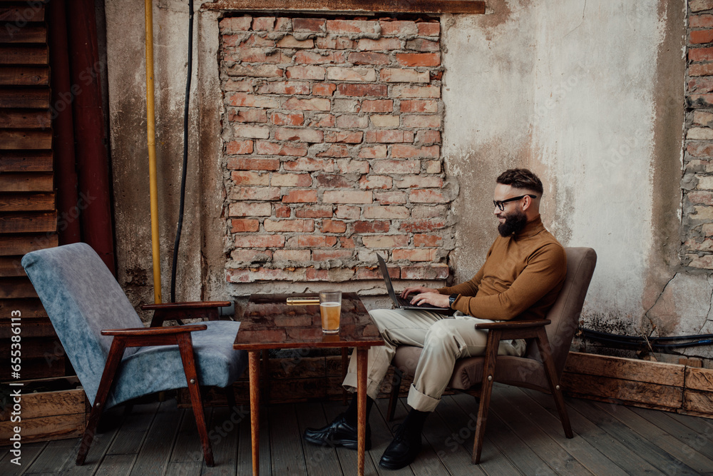 A stylish male freelancer is working on a new startup project, analyzing data using a laptop and a 5G wireless internet connection in a city cafe on a summer terrace with a free Wi-Fi zone