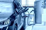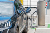 A modern electric car is charged from a city electric charger.