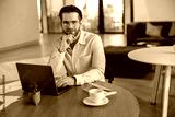 Male manager drinking coffee during working on laptop in modern office . High quality photo