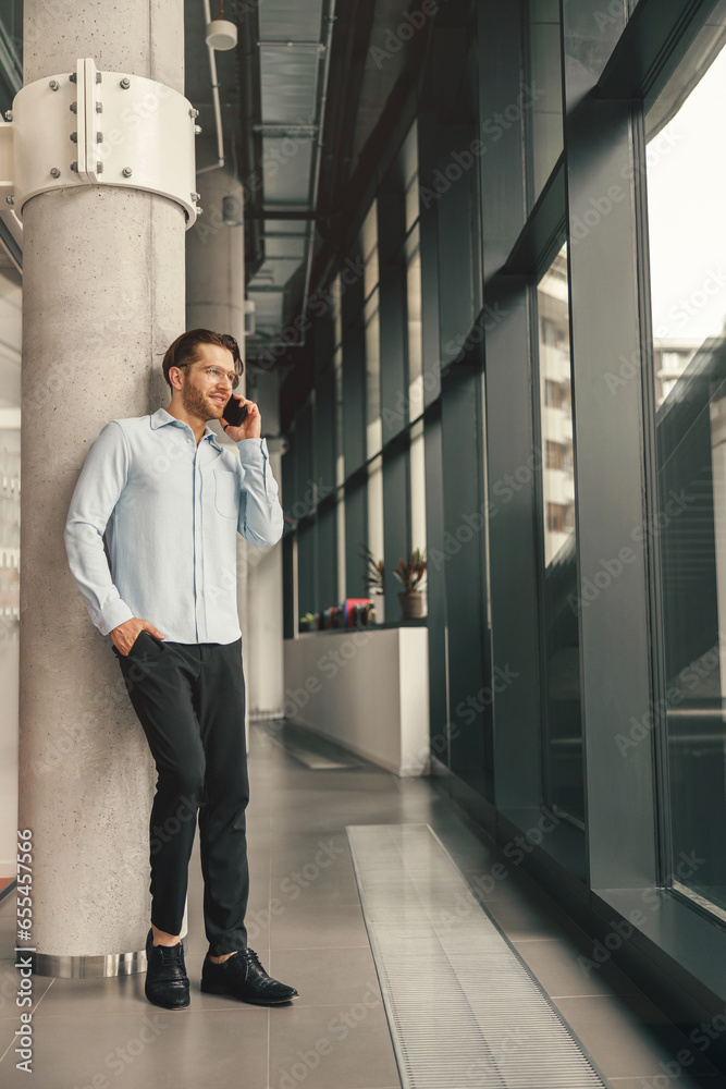 Male sales manager talking phone with client while standing in coworking and looking at side