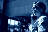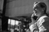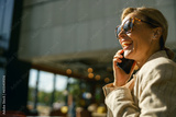 Close up of business woman in eyeglasses talking phone with client on modern office background