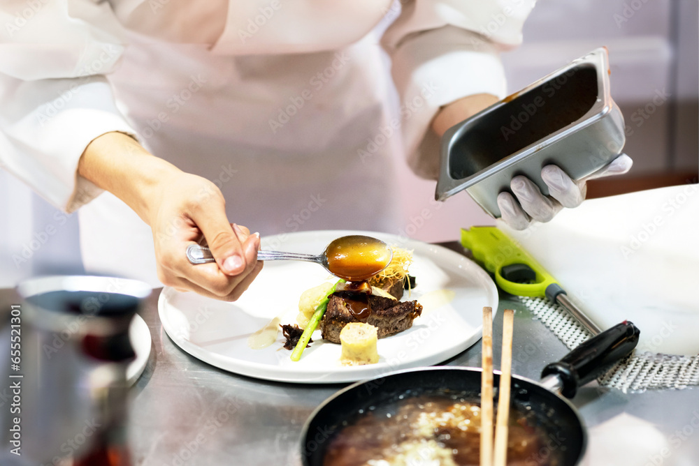Chef preparing food, meal, chef cooking in the kitchen, Chef decorating dish, chef at work