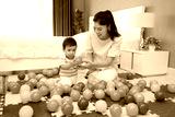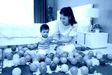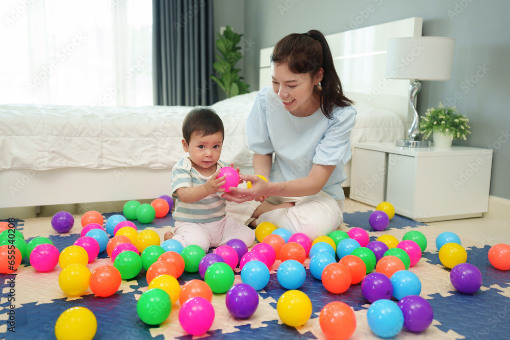 happy infant baby playing colorful plastic balls with mother on jigsaw mat in bedroom