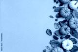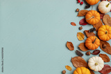 Autumn Thanksgiving holiday background from pumpkins, colorful dried leaves and fall decorations top view..