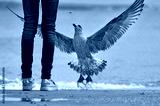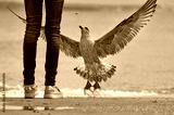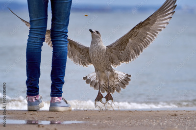 Silbermöwe (Larus argentatus) braunes Jungtier springt nach dem Futter, das ein Mädchen in Jeans und Turnschuhen am Strand fallen lässt - Usedom, Ostsee, Deutschland