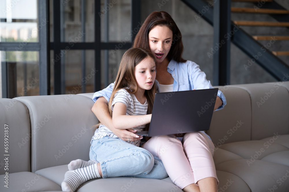 Delighted woman and kid watching video on laptop, sitting on sofa at home