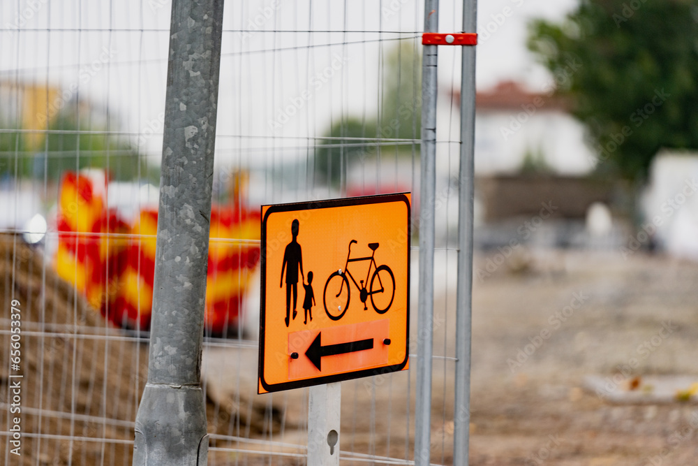 Pedestrian and bicycle walking sign on a temporary metal construction fence