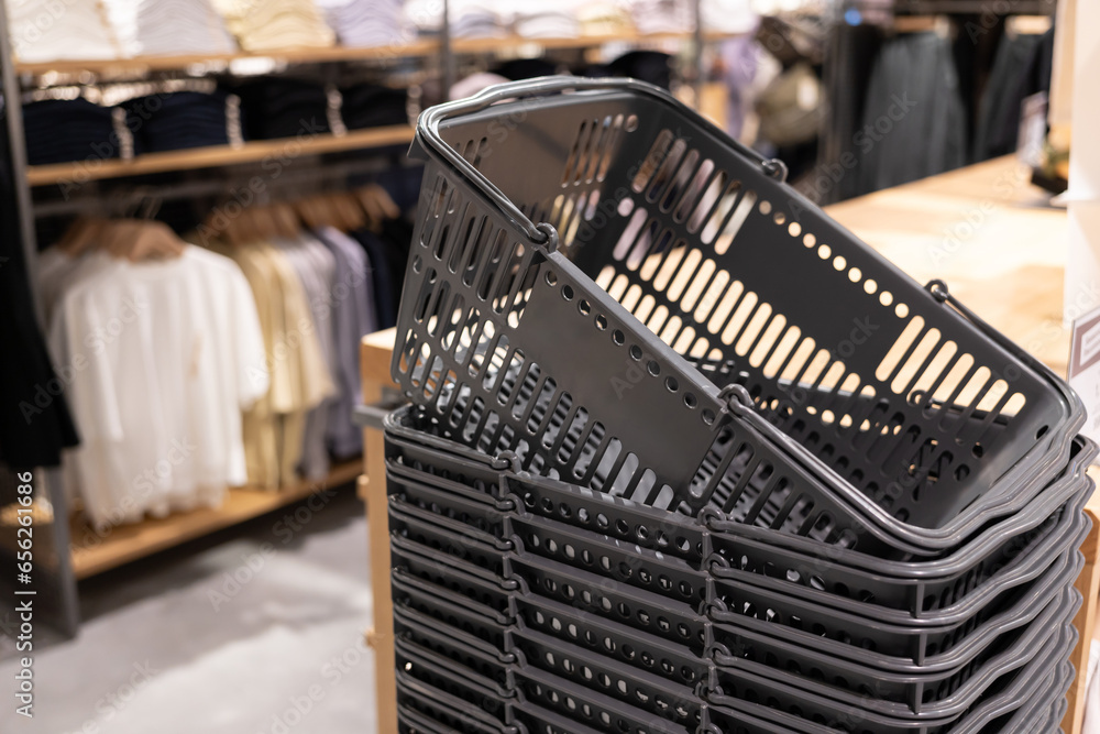 Stack of gray shopping basket in a clothes store. Shopping basket is used to carry the shopping items in a supermarket, mini market, store, or department store.