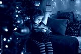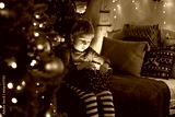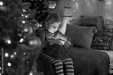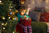 Cute preschool child, blond boy with pet dog, opening presents at home, decorated Christmas room