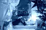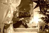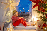 Toddler child, cute blond boy, sitting on the window in pajama, looking out for Satna Claus, Christmas lights around him