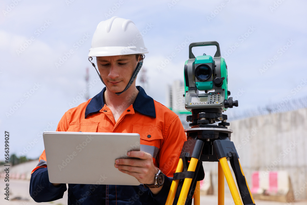 Engineer use theodolite equipment and looking blueprints on tablet construction project for route surveying to build a bridge