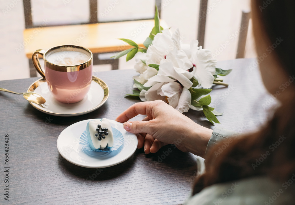 Blue macaroon dessert, original and stylish dessert in cafe in front of window, Hand holding plate with tasty sweet