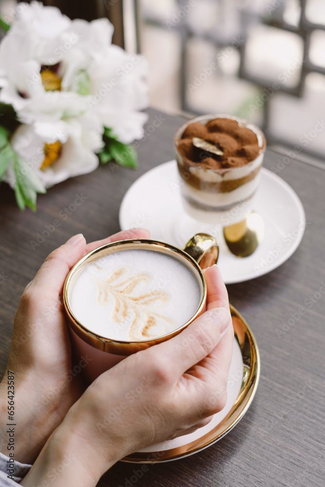Pink coffee cup on the table in cafe over the window. Flowers and tiramisu served for morning drink. Hands holding cup