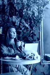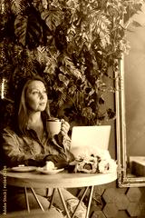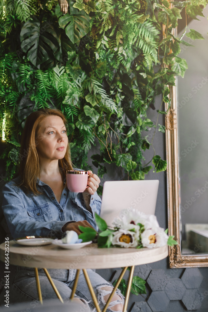 Woman working on laptop in cafe. Middle-aged freelancer with cup of coffee typing and reading. Loft working place with green plants