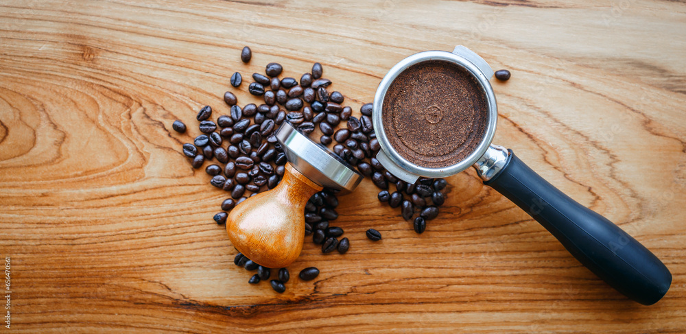 Top view of equipment in a coffee shop of barista coffee tool portafilter with tamper and dark roasted coffee beans on wooden background