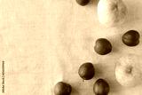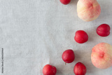 Right side frame and copy space of red ripe plums and peaches scattered on gray fabric