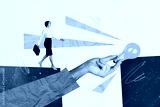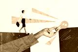 Creative trend collage of walking office female entrepreneur over bridge electric bulb idea businesswoman manager genius template metaphor