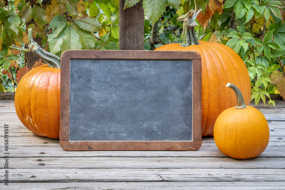 blank retro slate blackboard sign a rustic wooden deck with pumpkins