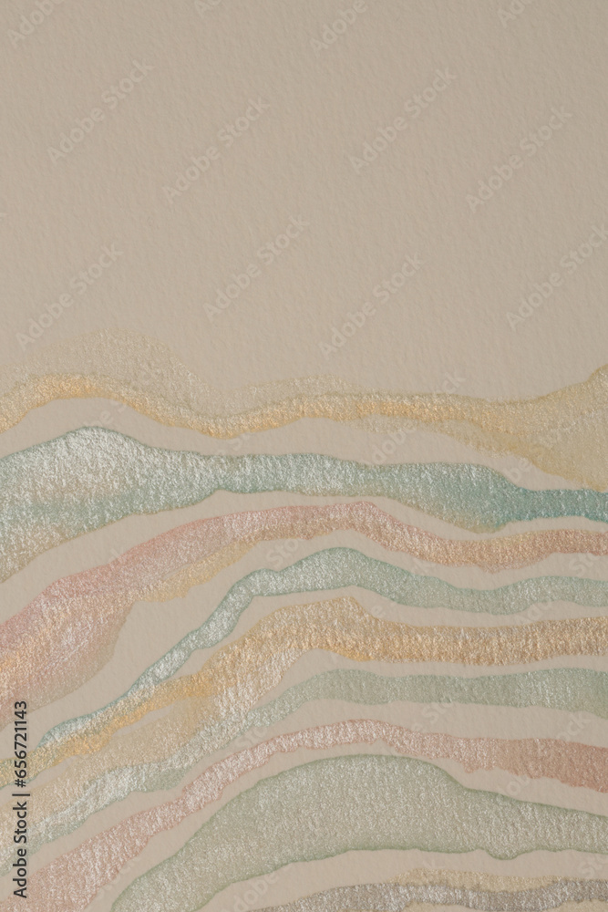 Beige, gold, silver nacre ink watercolor wave line stain blot on grain paper texture background.