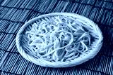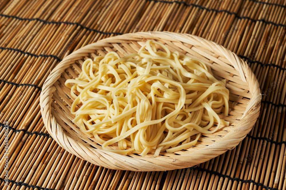 egg yellow noodle pasta on bamboo mat table background. egg yellow noodle pasta table background. egg yellow noodle pasta