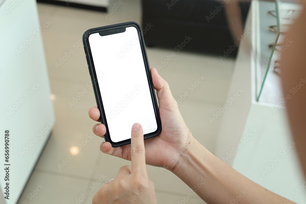 Hand holding phone with blur background, using smartphone, mobile phone in hand