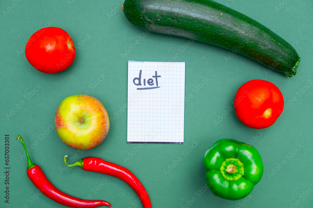 notebook with the inscription diet, next to vegetables, fruit and chicken on a green background. Losing weight and taking care of your figure.