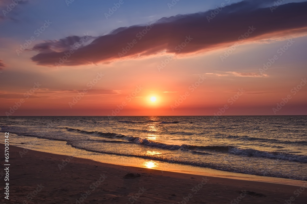 Beautiful colorful sunset over the sea. Sandy beach in the evening on the Polish Baltic Sea.