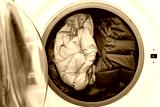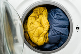 Blue and yellow winter puffer jacket in the drum of washing machine in laundry room. Washing dirty down jacket in the washer