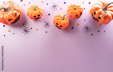 Halloween decorations made from pumpkin, paper bats, black spider on pastel background