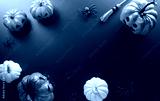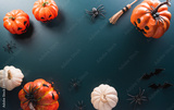 Halloween decorations made from pumpkin, paper bats, black spider on dark background