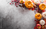 Thanksgiving and Autumn decoration concept made from autumn leaves and pumpkin on stone background. Flat lay, top view with copy space.