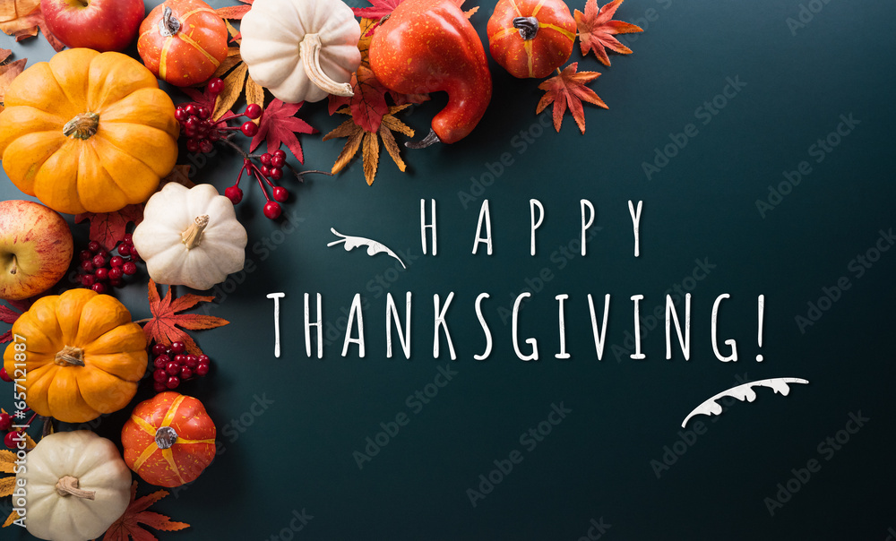 Thanksgiving and Autumn decoration concept made from autumn leaves and pumpkin on dark background. Flat lay, top view with copy space.