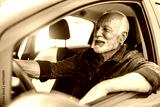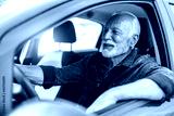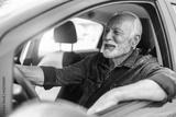 Happy man feeling comfortable sitting on driver seat in his new car. Smiling mature businessman with seat belt on driving vehicle for transport and copy space.
