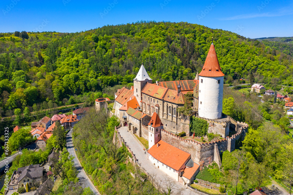 Aerial view of castle Krivoklat in Czech republic, Europe. Famous Czech medieval castle of Krivoklat, central Czech Republic. Krivoklat castle, medieval royal castle in Central Bohemia, Czechia.