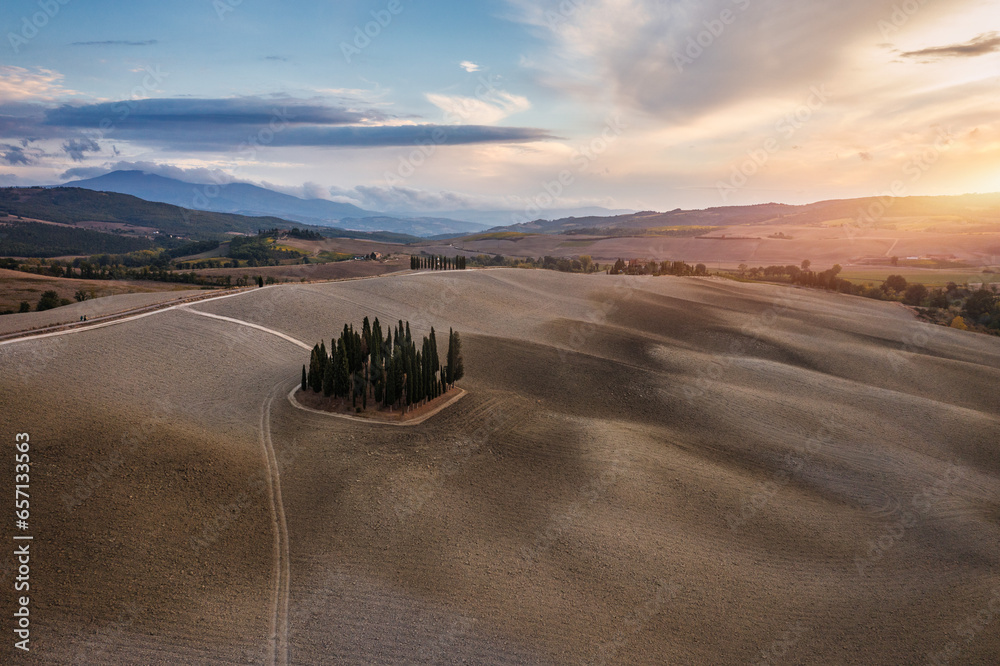 Hills, olive gardens and small vineyard under rays of morning sun, Italy, Tuscany. Famous Tuscany landscape with curved road and cypress, Italy, Europe