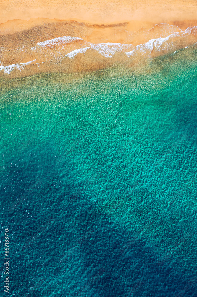 Beach with turquoise water on Fuerteventura island, Spain, Canary islands. Aerial view of sand beach, ocean texture background, top down view of sea waves by drone. Fuerteventura, Spain.