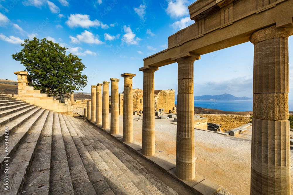 Ruins of Acropolis of Lindos view, Rhodes, Dodecanese Islands, Greek Islands, Greece. Acropolis of Lindos, ancient architecture of Rhodes, Greece.