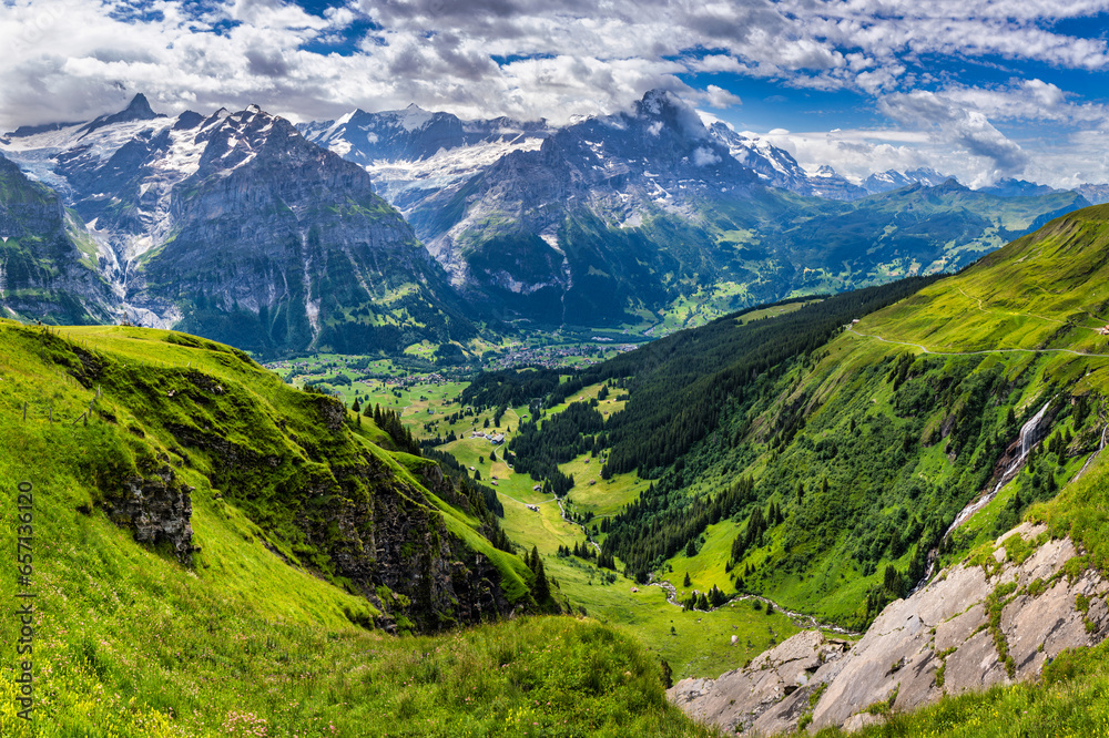 Grindelwald view and summer Swiss Alps mountains panorama landscape, green fields and high peaks in background, Switzerland, Bernese Oberland, Europe.