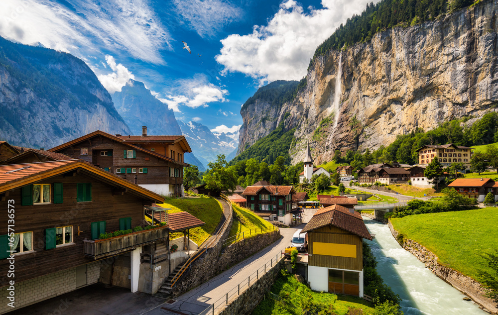 Famous Lauterbrunnen town and Staubbach waterfall, Bernese Oberland, Switzerland, Europe. Lauterbrunnen valley, Village of Lauterbrunnen, the Staubbach Fall, and the Lauterbrunnen Wall in Swiss Alps.