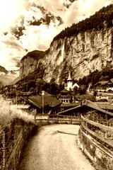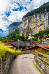 Famous Lauterbrunnen town and Staubbach waterfall, Bernese Oberland, Switzerland, Europe. Lauterbrunnen valley, Village of Lauterbrunnen, the Staubbach Fall, and the Lauterbrunnen Wall in Swiss Alps.
