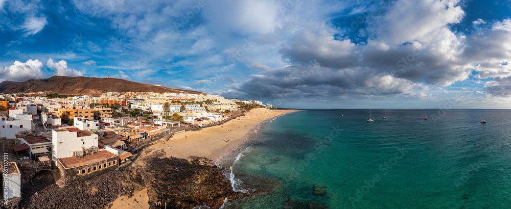 Morro Jable, Fuerteventura, Spain. Breathtaking beach Playa del Matorral in the rays of the sunset. Morro Jable and Playa del Matorral, Fuerteventura, Canary Islands, Spain, Atlantic, Europe
