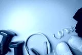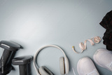 Workout flat-lay with sneakers, dumbbell, and headphones on gray background top view. Sport and fitness concept