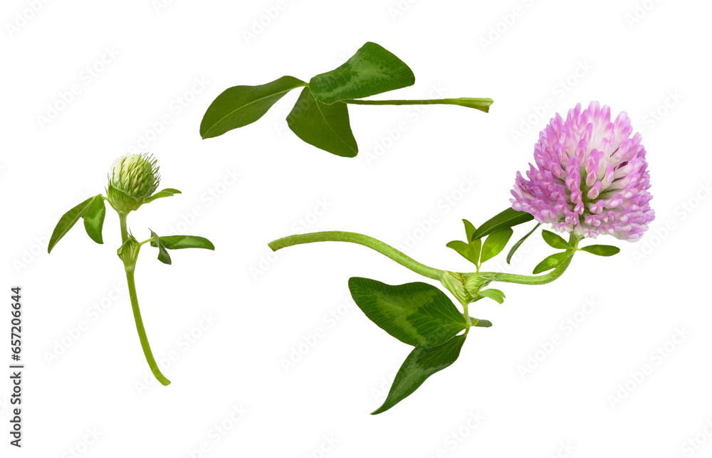 Set of pink clover flower, bud and leaves isolated on white or transparent background