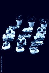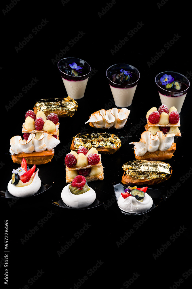 Desserts pistachio eclairs, raspberry cakes, panna cotta, edible gold eclairs, meringue with cream and strawberries.