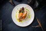 Roasted breaded chicken fillet with mashed potatoes and fresh salad.