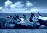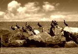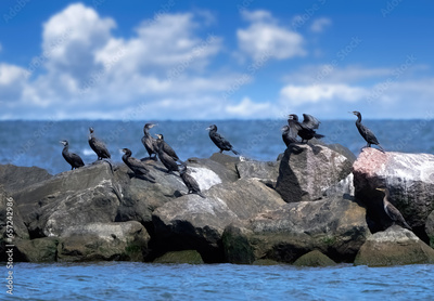 Gruppe Kormorane (Phalacrocorax carbo) sitzt auf großen Steinen eines Schutzwalls im Meer - Usedom, Ostsee, Deutschland