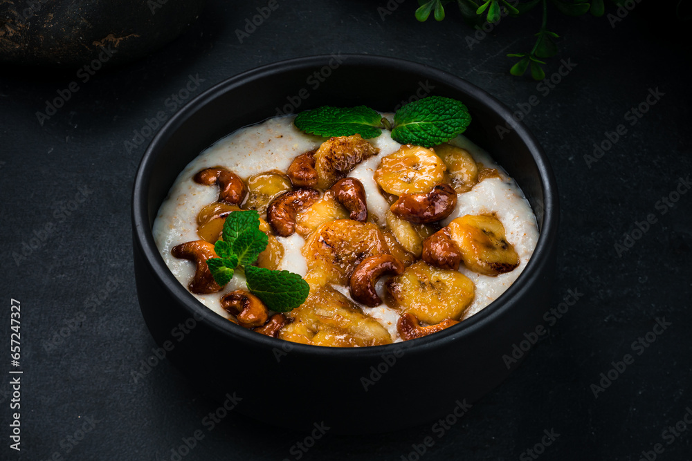 Breakfast boiled oatmeal with fried bananas, cashews and mint.